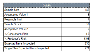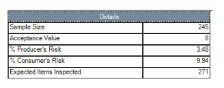 抽样方案会显示在表格中。样本量和接受值决定了抽样方案。生产方风险是在AQL错误拒收该批产品的风险。消费方风险是相对于指定风险的实际风险。由于抽样方案的离散性,精确值并不总是等于指定的方案。精确值一并显示在表格中。