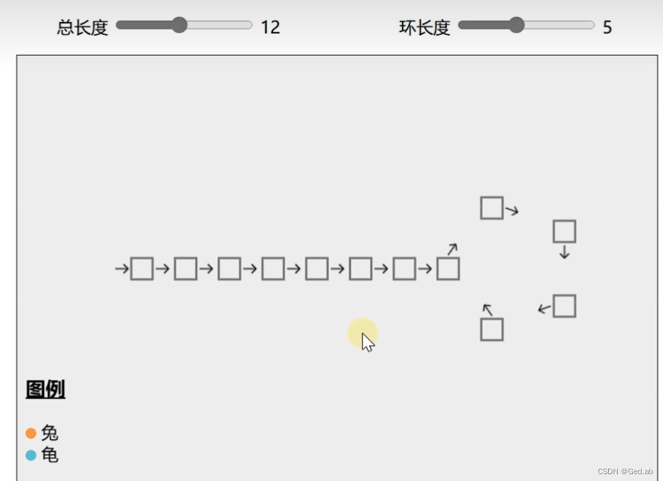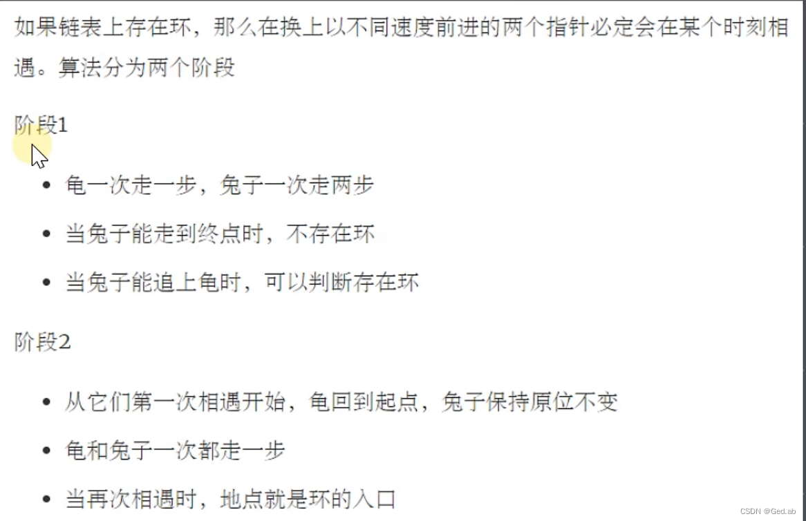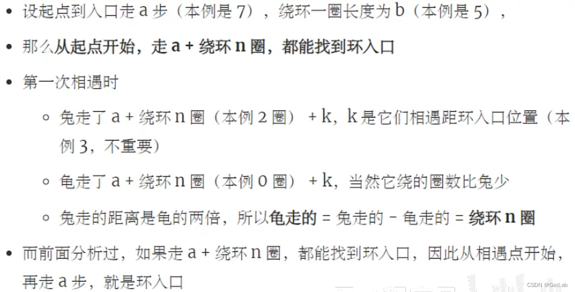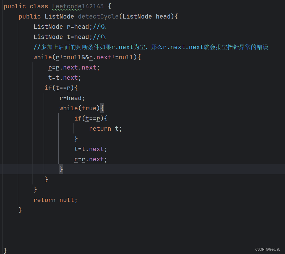 第一个while循环条件正如代码中的注释所说,当r,next为空时,再去调用next就会报空指针异常,然后当兔兔指针追上龟龟指针的时候,就要执行阶段二了,如上图分析,相遇之后,龟龟所走的距离就是n圈,再走a步就能找到环的入口,但是我们不一定知道a是多少,因为链表不一定是我们自己设置的,所以就要将兔兔指针送回起点,把兔兔指针变为龟龟指针,当两个龟龟指针相遇的时候,就是环的起点。