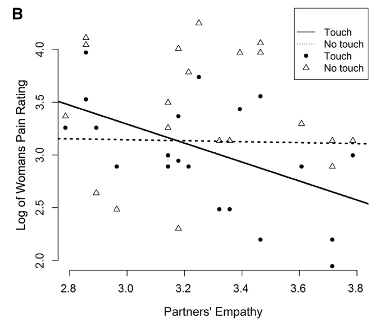 触摸+疼痛条件下比无触摸+疼痛的同理心精度(empathic accuracy)要高,这就表明伴侣的触碰增加了同理心精度。