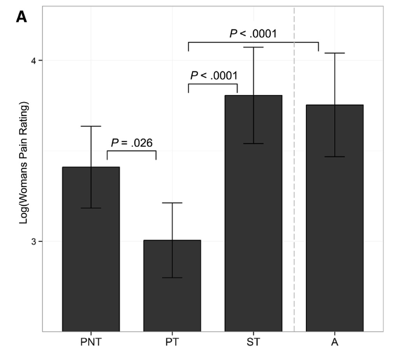 △A:仅疼痛;PNT:与伴侣无接触;PT:与伴侣接触;ST:与陌生人接触。