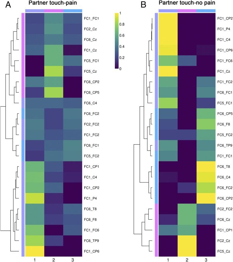 这一步主要是在触摸+疼痛和无触摸+疼痛条件下,使用NMF(统计分析)方法对脑间连接进行聚类。