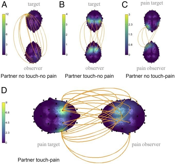 图中的“target”是女性伴侣(痛苦目标),“observer”是男性伴侣(触摸者),橙色线条代表统计显著的脑间连接,头皮上的颜色代表该区域的连接个数。