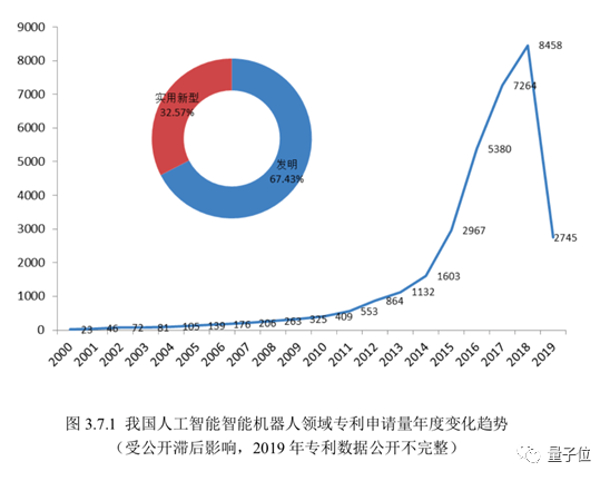 报告中专门指出,智能机器人领域的实用新型占比 32.57%,发明占比 67.43%, 说明有三成多的发明创造以短平快的方式提出。