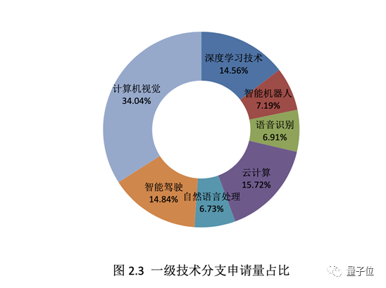 其后按照数量排序分别是占比 7.19%的智能机器人技术、占比6.91%的语音识别、 占比6.73%的自然语言处理技术。