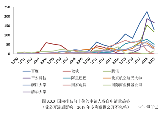 而回顾这前十名机构历年的申请数量,会发现百度、平安科技、腾讯等中国互联网公司近年来申请非常积极,而在2004~2006年,这一领域还是微软的天下。