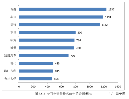 而智能驾驶专利的申请者Top 10排行,则和前面几类的排名大不同,只有位于第十名的吉林大学一所高校,其他位置则被丰田、福特、本田、博世、通用、现代、吉利等汽车公司和汽车供应链公司占据。