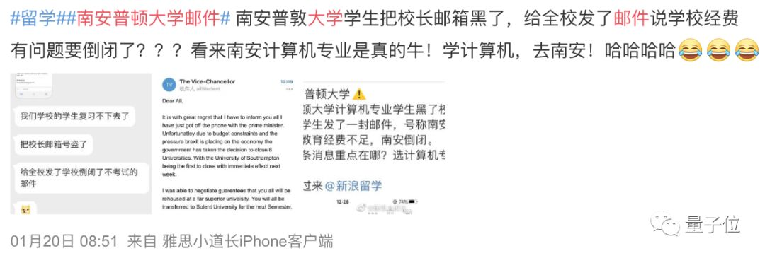 南安普顿大学一名计算机系学生因考试压力,恶搞黑进了副校长的邮箱,发送了一封假邮件宣布学校因英国脱欧经济压力将关闭,并取消一月份的考试。这一事件引起学生和家长的恐慌,直到学校发言人辟谣才平息风波。