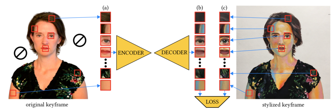 从原始关键帧(Ik)中随机抽取一组图像块(a),在网络中生成它们的风格化对应块(b)。