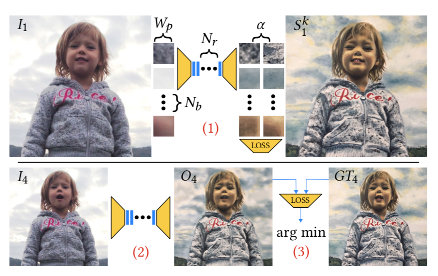 也就是说,该方法实际上是一种翻译过滤器,可以快速从几个异构的手绘示例 Sk 中学习风格,并将其“翻译”给视频序列 I 中的任何一帧。