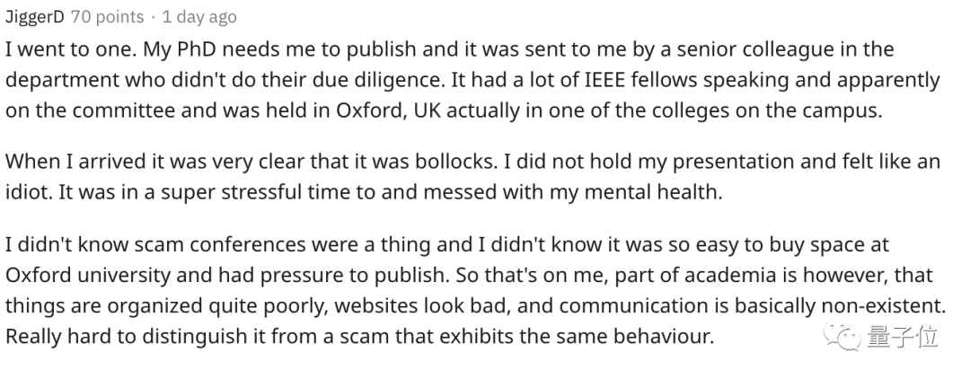 有网友反应,当年不谙世事时,曾去过一个假学术会议,不可思议的是,这个假会议还租到了牛津大学的场地。但到了会场才发现组织水平低下,学术价值寥寥,参会嘉宾的发言也令人尴尬。