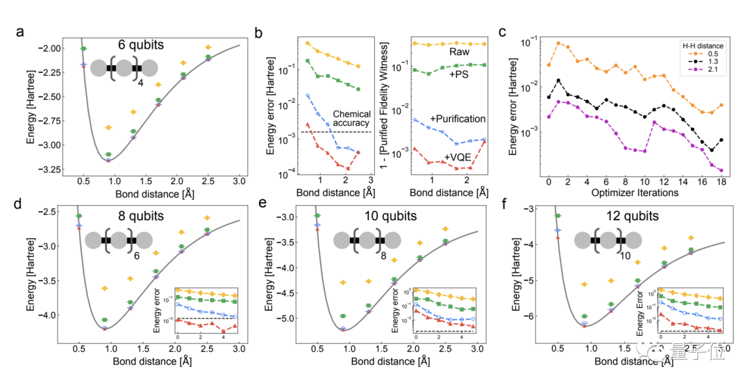 谷歌先计算6到10个氢原子组成的氢链的结合能。原始方法(下图中的黄色)效果一般,与VQE等算法结合后,量子计算机求得的结果与真实值几乎完全吻合。