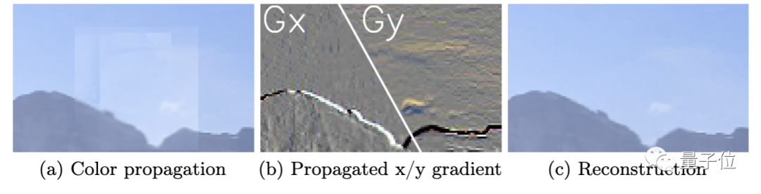然后,再在梯度域中,使用置信度加权平均,融合每个缺失像素点的候选对象以重建颜色。