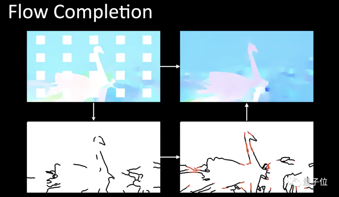 然后,计算相邻帧之间的光流,以及一组非相邻帧之间的光流,提取并补完流的边缘。下图中红线部分,即为神经网络“脑补”出来的边缘。