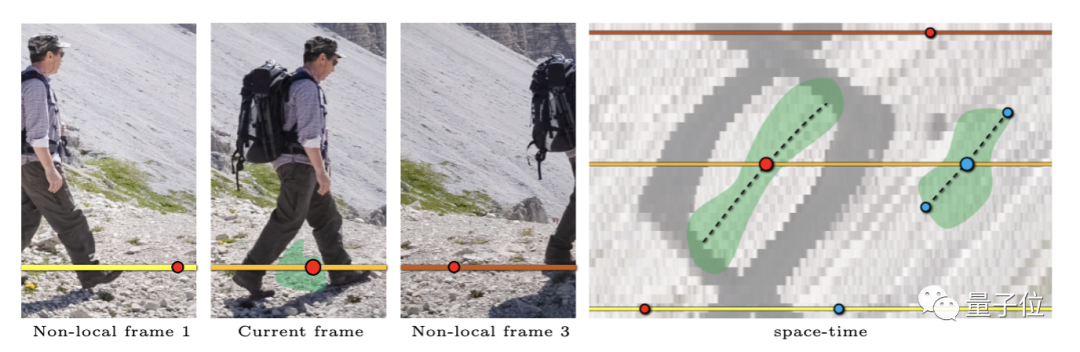 但在引入非相邻帧的非局部光流后,红色像素点就得到了额外的非局部领域(黄线和棕线上的红色像素点),由此,就可以计算出被人腿遮挡的真实背景。