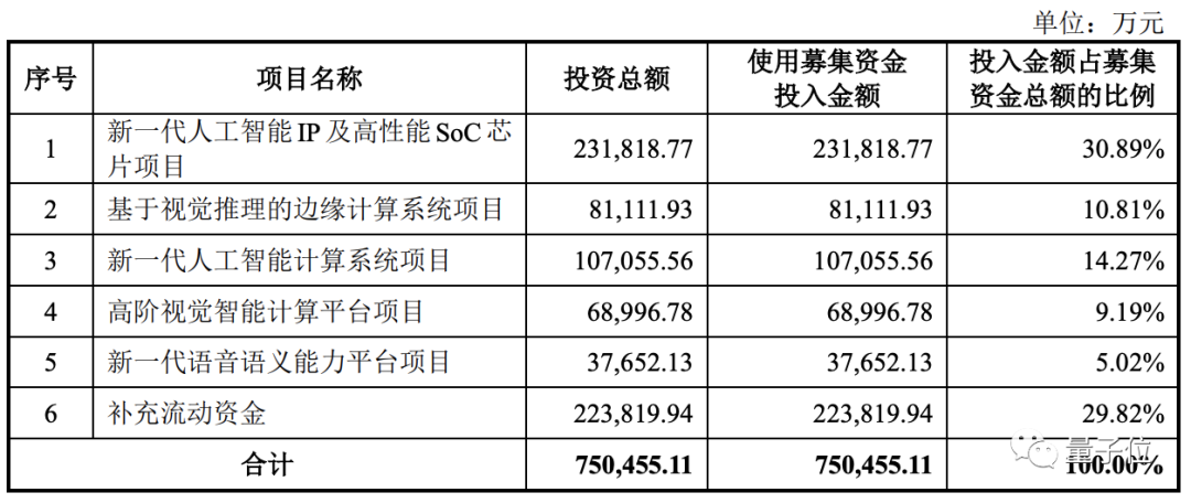 「新一代人工智能IP及高性能SoC芯片项目」、「新一代人工智能计算系统项目」,投入金额分别为23亿、10亿,占募集资金总额比例的30.89%、14.27%。