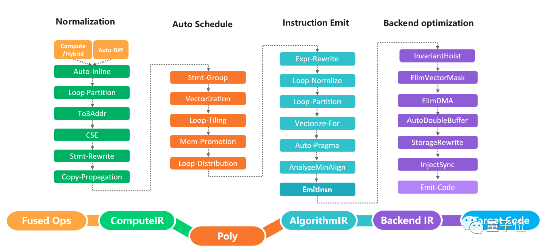自动调度:自动调度模块基于polyhedral技术,主要包括自动向量化、自动切分、依赖分析和数据搬移等。