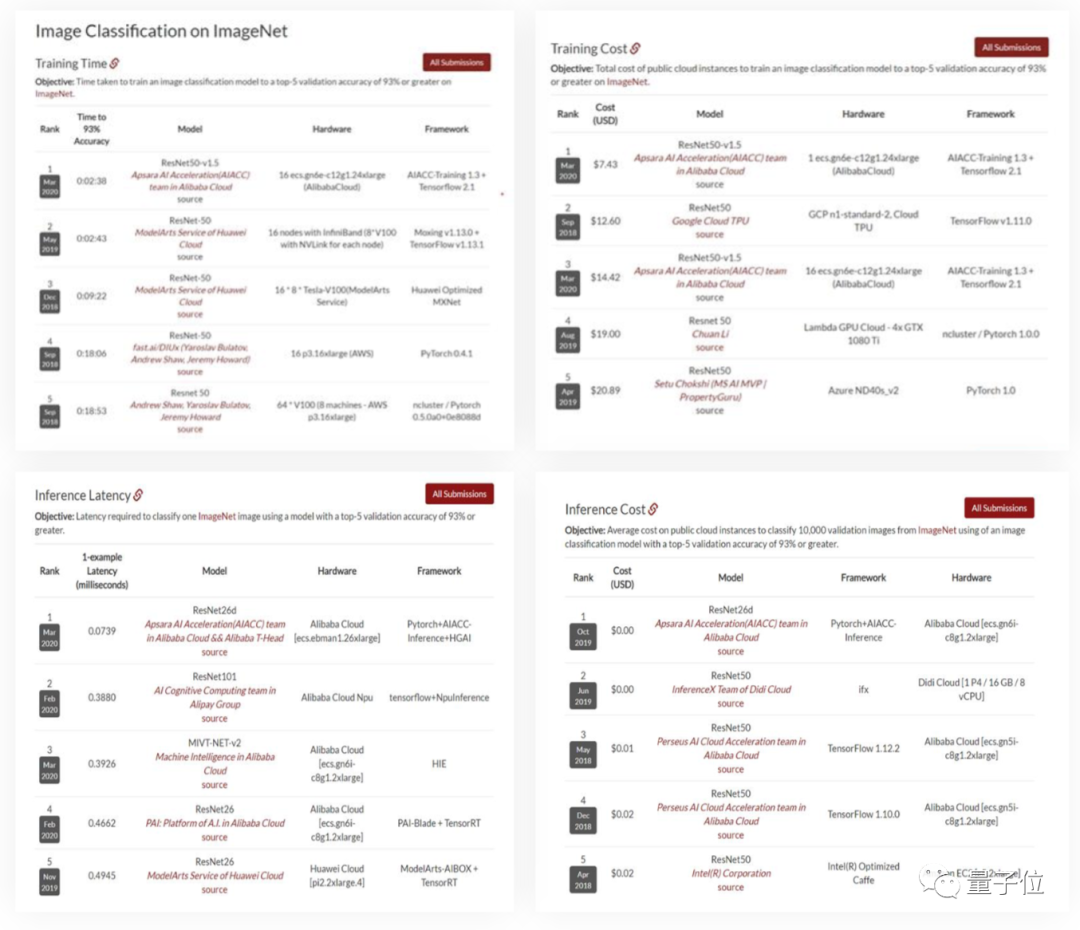 在AIACC的加持之下,今年3月,阿里云获得了斯坦福大学DAWNBench ImageNet四个榜单的世界第一。