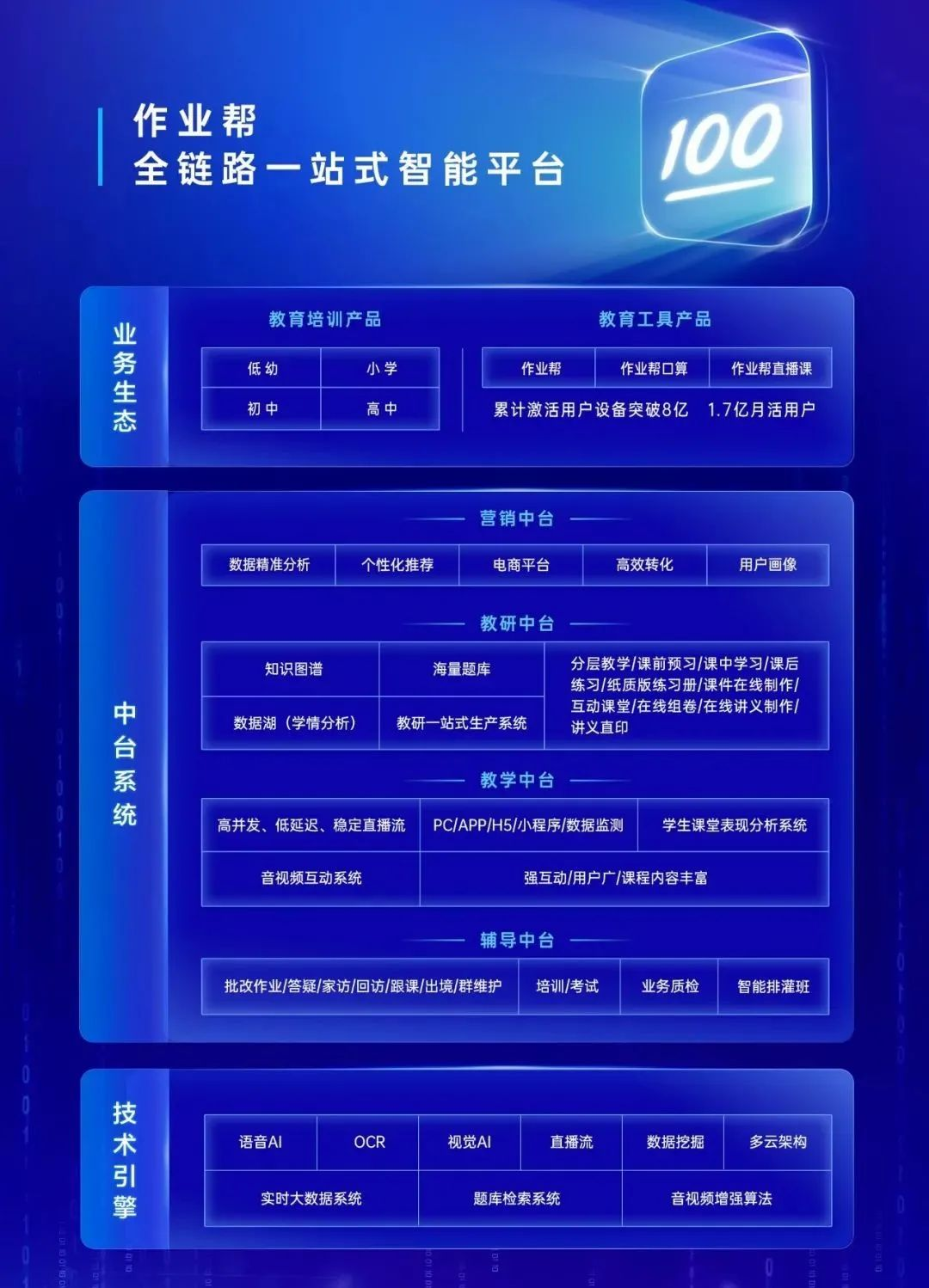 但这只是业务生态,背后还有营销中台、教研中台、教学中台、辅导中台,以及囊括OCR、语音AI、直播流、数据挖掘和多云架构技术的引擎为支撑。