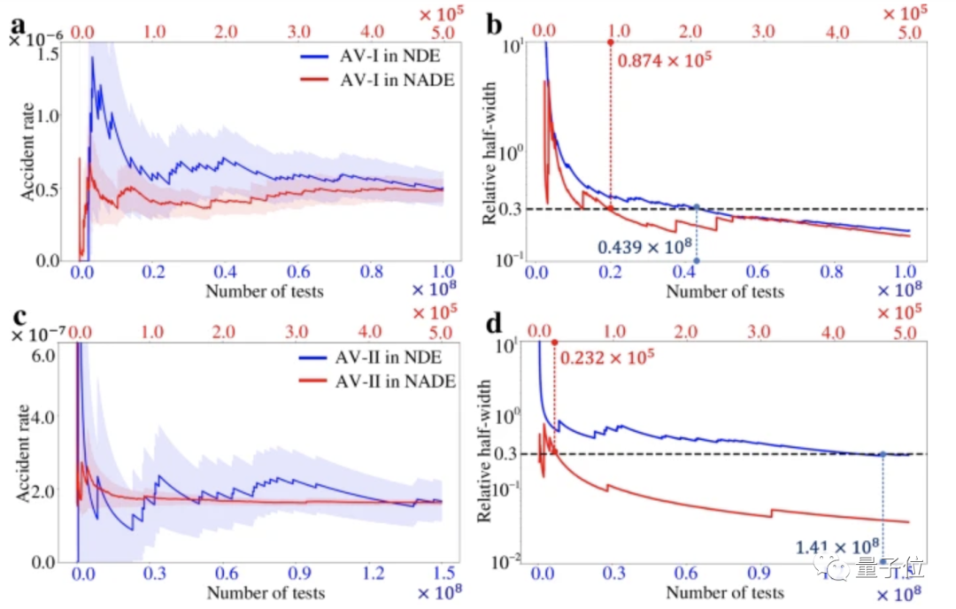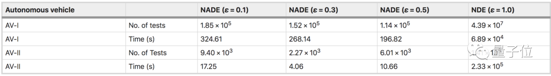 具体计算一下,对于AV-I模型,NADE只需要8.74×104次测试,而NDE需要4.39×107次测试。NADE加快进程约500倍,减少约1000万英里的里程。