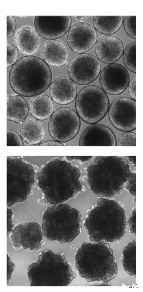 △1个月大皮质器官的冷冻切片,上为人类器官,下为古基因变体的类器官