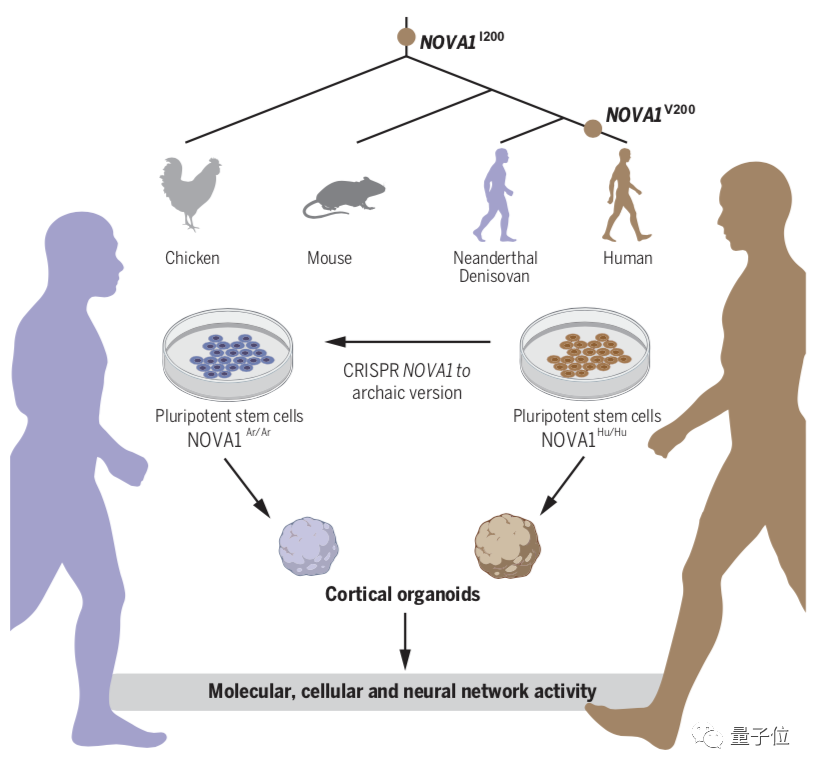 因此研究人员使用基因编辑技术,在多功能干细胞中将人类的NOVA1等位基因替换成尼人和丹人的等位基因。结果导致了一种氨基酸的变化——异亮氨酸变成缬氨酸。