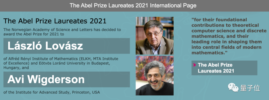 匈牙利数学家拉兹洛·洛瓦兹(László Lovász)和以色列计算机科学家艾维·维格森(Avi Wigderson)共享2021年该奖项。