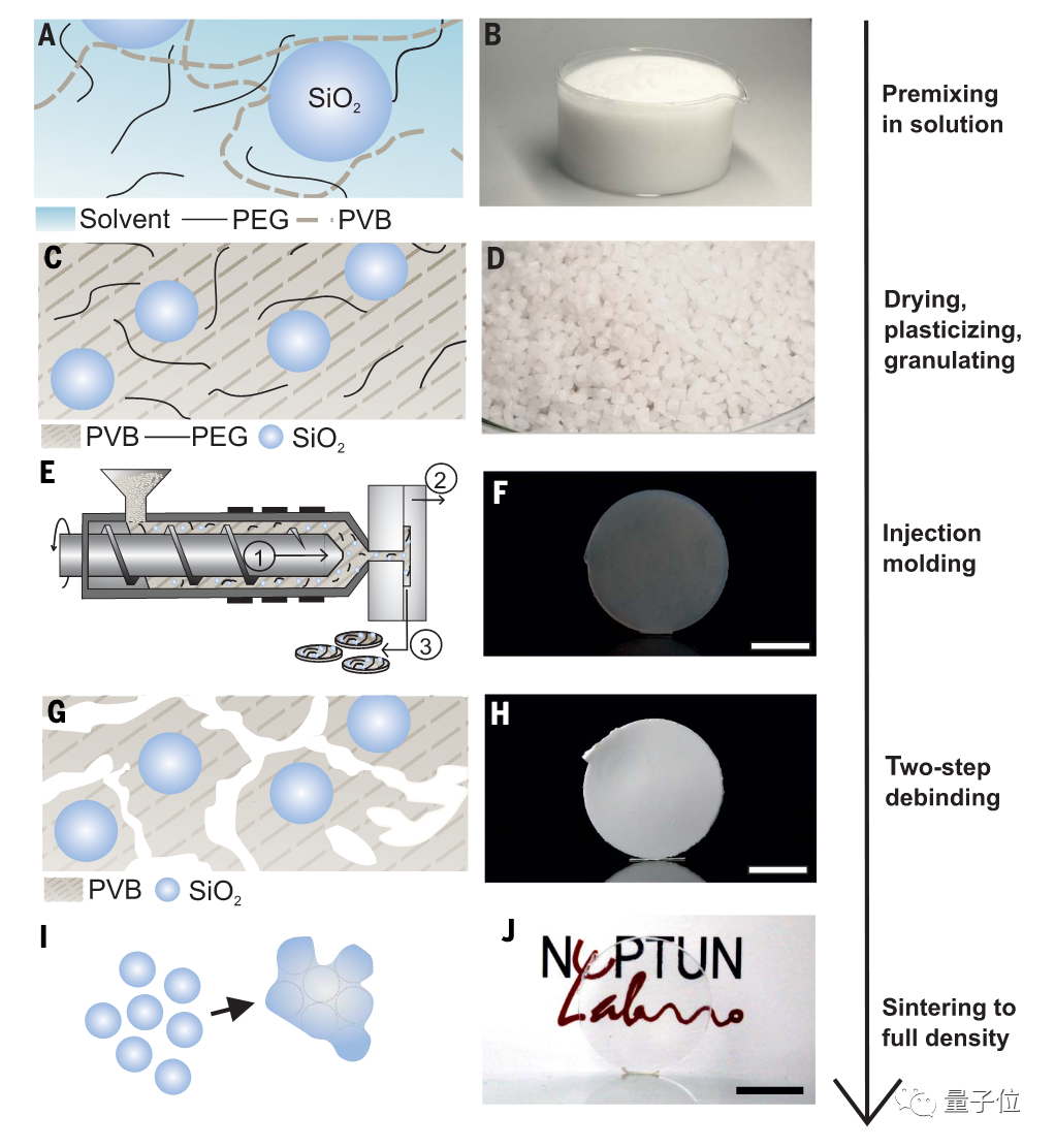 首先,研究人员将二氧化硅纳米粉、乙烯醇缩丁醛(PVB)溶液、乙烯醇缩丁醛(PEG)溶液预混合, 通过蒸发,得到了热塑性二氧化硅复合材料。