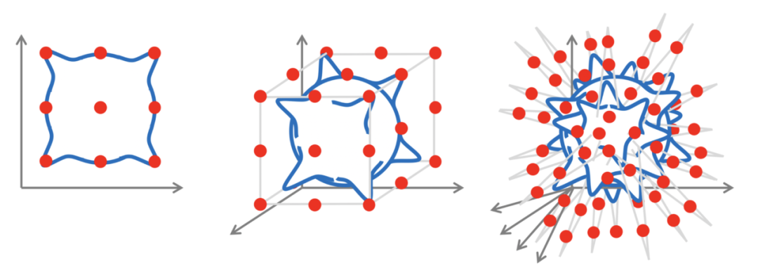 △维度诅咒的图示:为了近似由高斯核构成的Lipschitz连续函数,该函数位于误差为ε的d维单位超立方体(蓝色)的象限中,需要????(1 /εᵈ)个样本(红点) 。