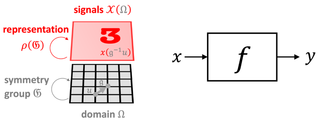 输入信号底层的域的几何结构为我们试图学习的函数 f 的类别施加了架构信息。一个不变函数可以不受群的操作作用的影响,即对于任何????∈????和x,f(ρ(????)x)= f(x)。另一方面,函数可能具有相同的输入和输出结构,并且以与输入相同的方式进行转换,这种函数称为等变函数,即满足f(ρ(????)x)= ρ(???? )f(x)。