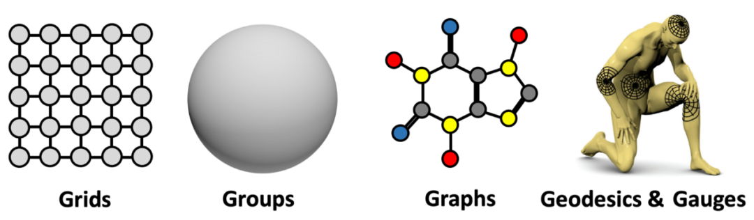 这是一种非常通用的设计,可以应用于不同类型的几何结构,包括几何深度学习的“ 5G”(Grid,Groups,Graphs,Geodesics & Gauges):网格(具有全局转换群的齐次空间),图形(以及特殊情况下的集合)和流形,几何先验通过全局等距不变性表示(可以使用测地学表示) 和局部规范的对称性。