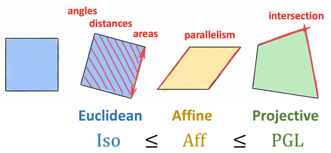 因此,刚性运动会产生传统的欧几里得几何,而仿射或投影变换分别产生仿射和投影几何。