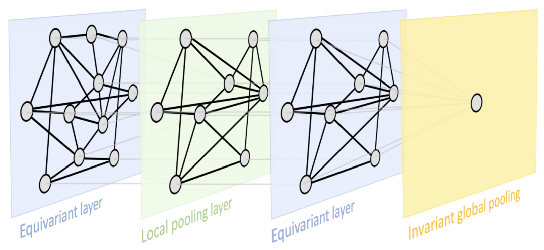 这两个原理为他们提供了一个非常通用的深度学习蓝图,可以在大多数用于表示学习的流行深度神经体系结构中得到认可:一个典型设计由一系列等变层(例如,CNN中的卷积层)组成,可能遵循通过不变的全局池层将所有内容聚合到一个输出中。在某些情况下,也可以通过一些采用局部池化形式的粗化过程(coarsening procedure)来创建域的层次结构。