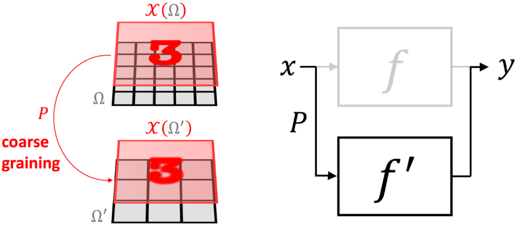 另一个强大的几何先验是“尺度分离”。在某些情况下,我们可以通过“同化”附近的点并产生与粗粒度算子P相关的信号空间的层次结构,来构建域的多尺度层次结构(下图中的Ω和Ω’)。