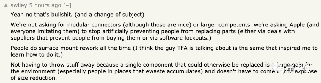 我们不要求模块化连接器或者更强大的功能,只希望苹果能够停止干预行为,阻止人们更换零部件。