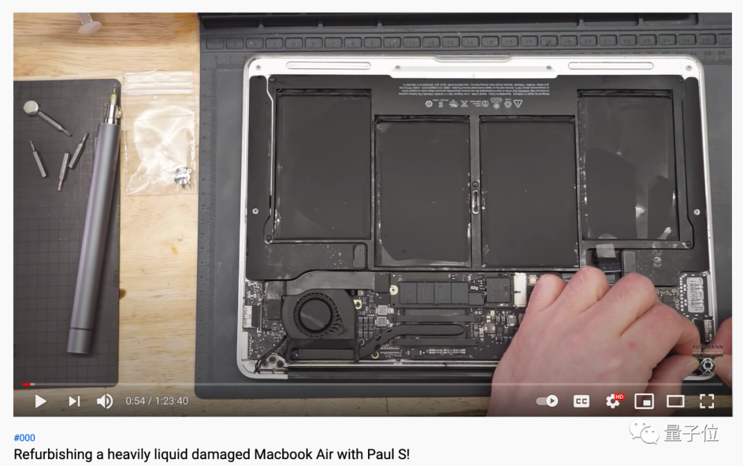 就比如,最近就发布了一个视频,维修对象是一台进了咖啡的MacBook,从打开主板,检查问题,到修复整个过程一气呵成,时长达1个多小时,