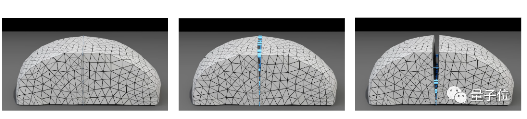 而为了能更真实地模拟土豆这样的材料在受到刀切时,自身发生的断裂情况,研究人员在引入连续损伤模型的基础上,在切割面两侧植入了“弹簧”,就像这样: