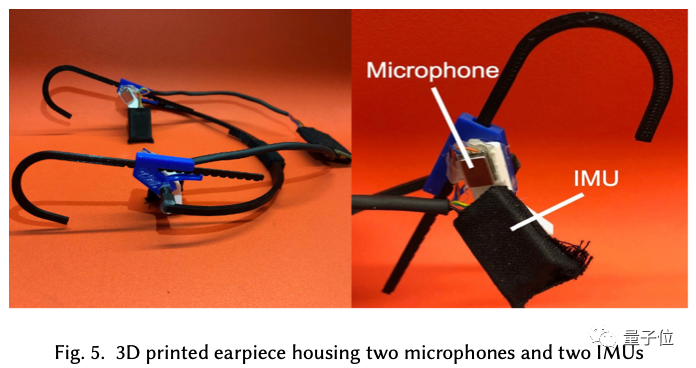 自然弯曲的PLA灯丝将IMU传感器压在耳朵下方的下颌骨处,并将麦克风固定到耳后的颞骨上,而麦克风则连接到可以放大和过滤声音信号的定制PCB板上。