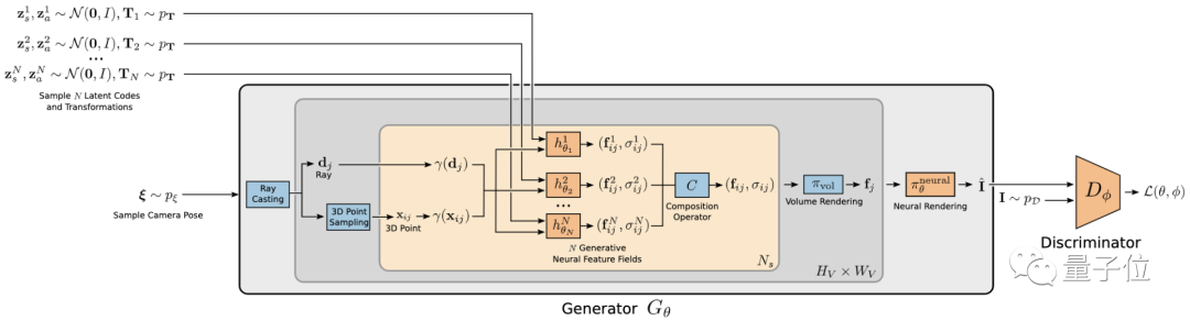 接下来,为每个对象采样一个视角,生成器将对象和背景合成到一个场景中。