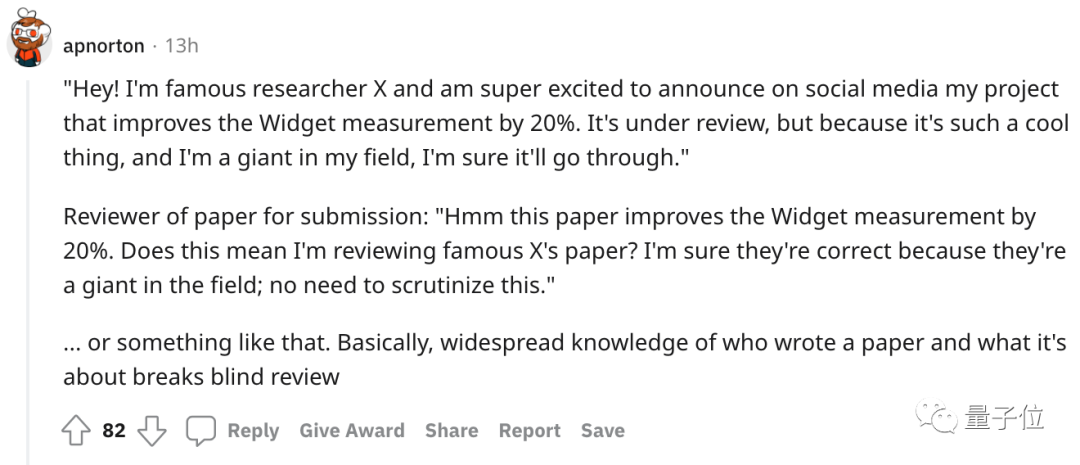 提交论文的审稿人:“嗯,这篇论文将Widget测量提高了 20%。这是否意味着我正在审阅著名的X论文?我确定他们是正确的,因为他们是该领域的巨头;因此没有必要仔细检查这个。”