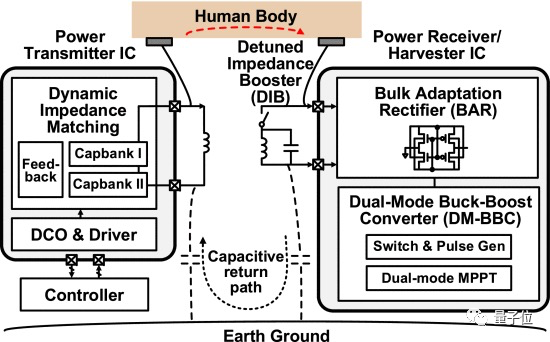 该电路通过适应发射器和接收器处,皮肤与电极接口寄生阻抗的变化来提高回收功率电平(recovered power level)。