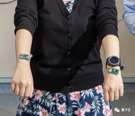 正如你所看到的,研究人员右手腕电子手表的下边是一个发射器 (transmitter),左手腕的则是接收器 (receiver)。