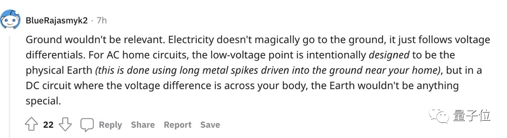 对此,有人给出了回答:不会接地的。因为在这个直流电路的系统中,电流随电压差流动,而电压差就在你身体里,地面在此时就不是什么特殊的导体了。