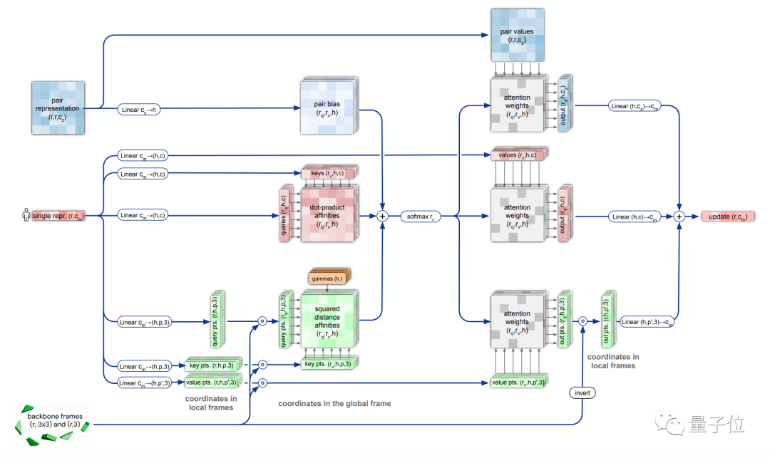 在这里,研究人员同样使用了Attention机制,它可以单独计算蛋白质的各个部分,称为“不变点注意力(invariant point attention)”机制。