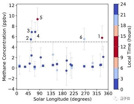 将检测到的峰值数据,和微量气体轨道卫星检测到的大气甲烷含量数据进行对比,没有得出有效结果。这可能是因为,由于昼夜差异,微量气体卫星没能成功捕获到大气层甲烷信息;也有可能火星大气层中没有甲烷,而探测器刚好位于地面甲烷来源中心附近。