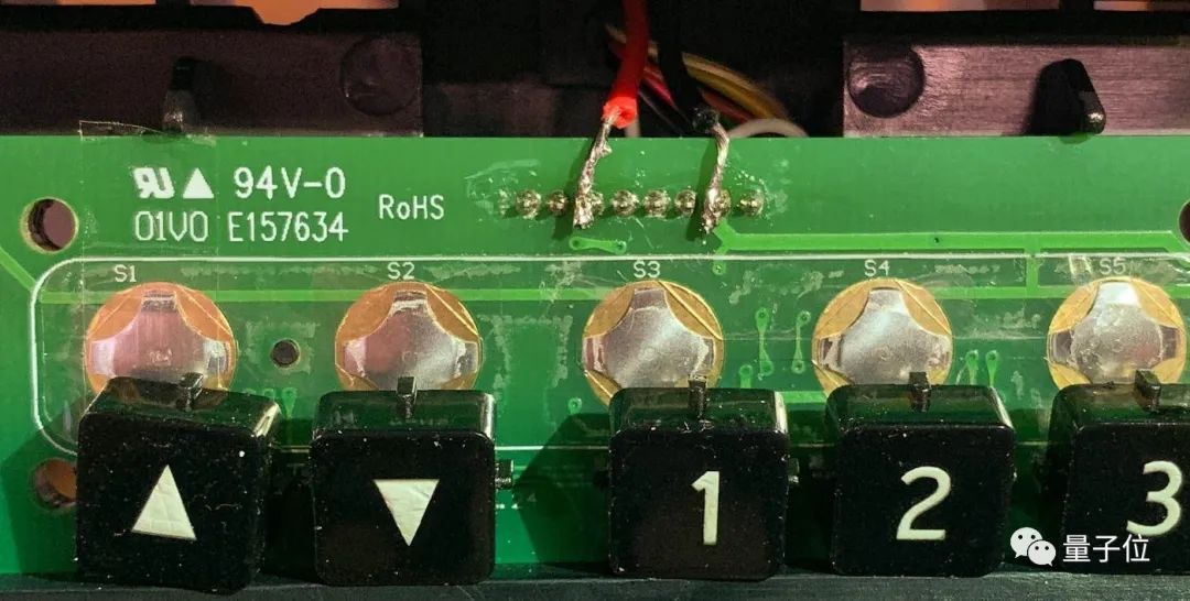 小哥找来了两根电线,把它们焊在了按钮“1”和“2”的引脚上: