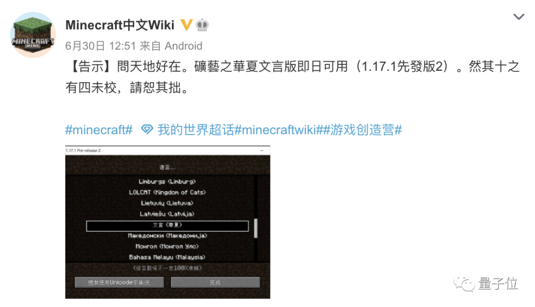不过6月30日,在翻译组并未收到提前通知的情况下,游戏官方就将文言文纳入了1.17.1 pre2版本。