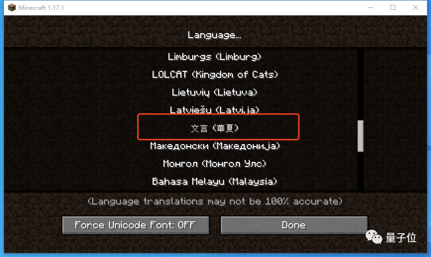 在更新的《我的世界》1.17.1版本中,文言文已被正式列入语言选项。