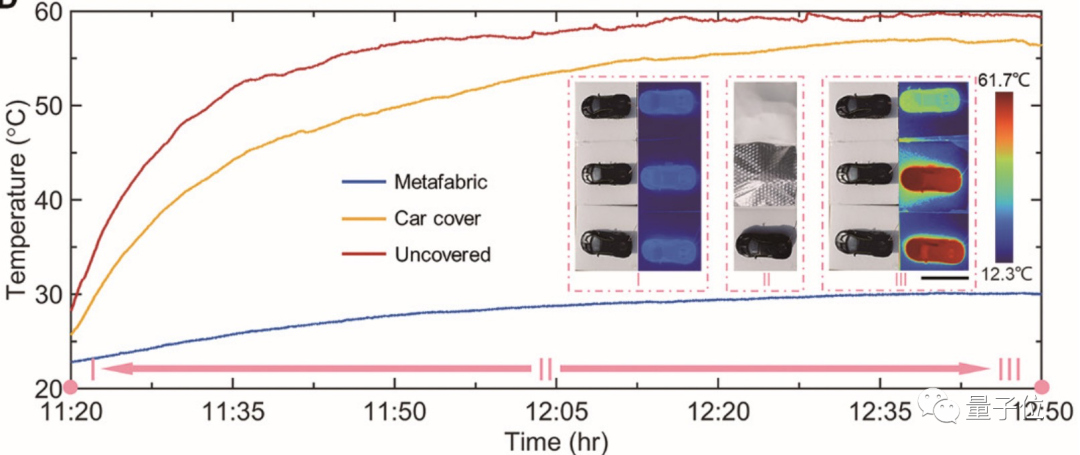 这把的效果很不错,该超材料遮罩下的汽车足足比市售车罩材料下的低了27°C,比啥也没盖的低了30°C。