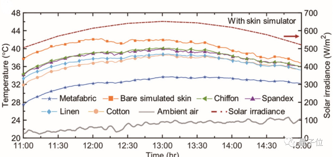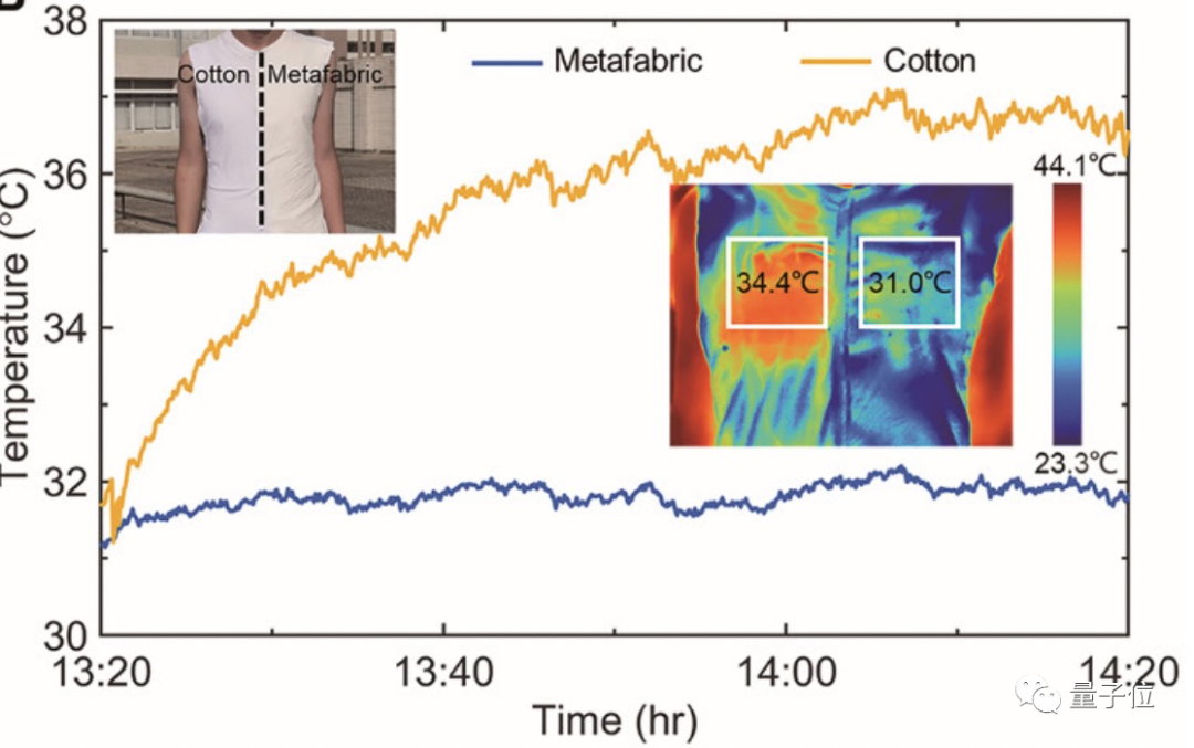 为了模拟更真实的情况,他们还让一位实验人员穿着一半棉一半该织物制成的背心晒太阳。
