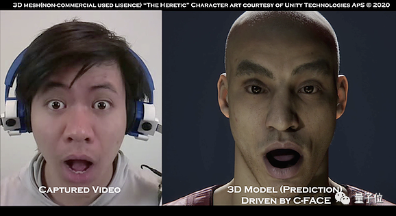 结合ARKit,从深度相机中提取了52个混合形状参数(blend-shape),以及头部偏转角度数据,重构出完整的表情。